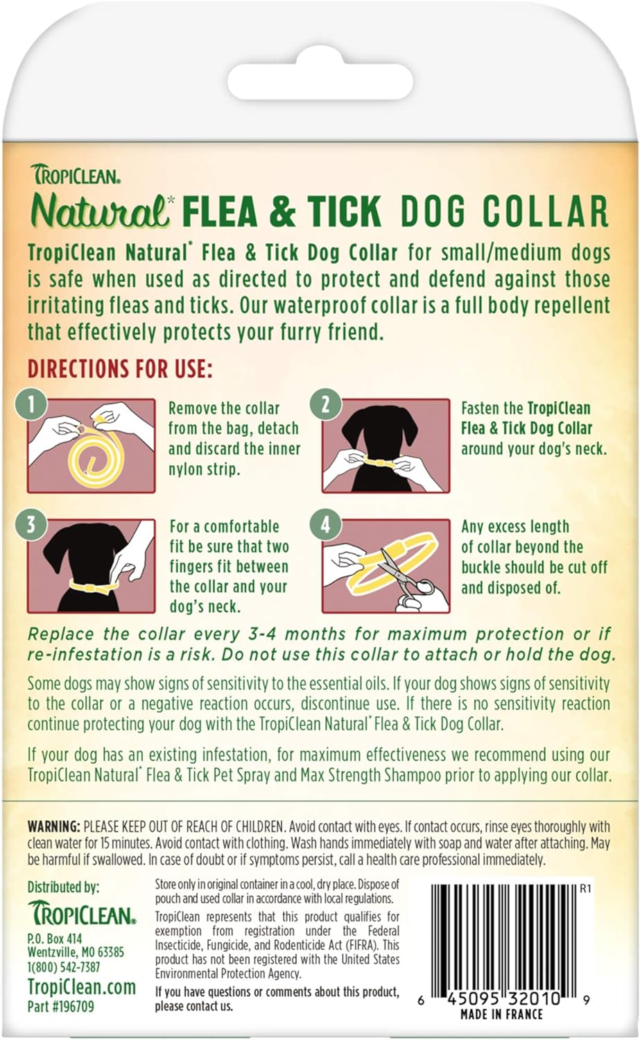 TropiClean Natural Flea & Tick Dog collar for small dogs is safe when used as directed to protect and defend against those irritating fleas and ticks. Our waterproof collar is a full body repellent that effectively protects your furry friend.Specifications