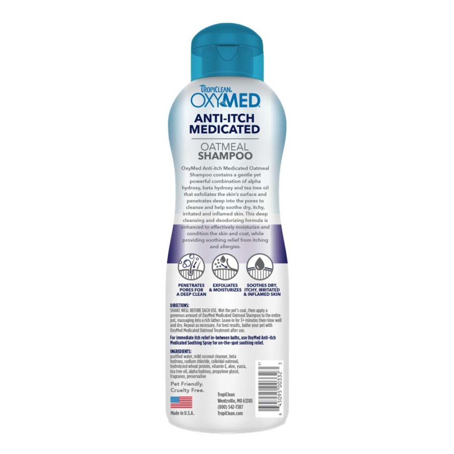 OxyMed Anti-Itch Medicated Oatmeal Shampoo contains a gentle yet powerful combination of alpha hydroxy, beta hydroxy, and tea tree oil that exfoliates the skin’s surface and penetrates deep into the pores to cleanse and help soothe dry, itchy, irritated, and inflamed skin. This refreshing, deep-cleansing dog shampoo for itchy skin is enhanced to effectively moisturize and condition the skin and coat while providing soothing relief from itching.Specifications