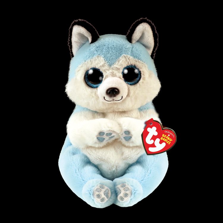 A bold Husky dog with black trimmed ear; Embroidered silver paws that reach out to hug you; Includes official Ty Heart with birthday and poem; Made with super soft blue and white fabric; Proudly poses for great pictures; Sparkly blue glitter eyes; Uniquely shaped, sitting in an attentive pose