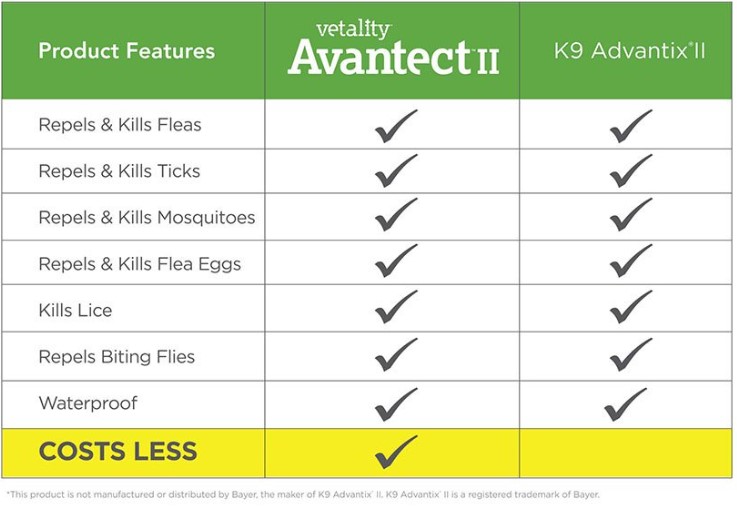 VETALITY AVANTECT II IS A VET-QUALITY TOPICAL FLEA & TICK SOLUTION CONTAINING IMIDACLOPRID, PERMETHRIN AND PYRIPROXYFEN THE ACTIVE INGREDIENTS FOUND IN K9 ADVANTIX II, BUT COSTS LESS. REPELS & KILLS FLEAS, FLEA EGGS, TICKS AND MOSQUITOES; REPELS BITING FLIES, KILLS LICE AND IS WATERPROOF. COMPARE THIS AFFORDABLE AND EFFECTIVE PRODUCT TO K9 ADVANTIX II FOR DOGS ACTIVE INGREDIENTS. VETALITY AVANTECT II, VET QUALITY PROTECTION, BUT COSTS LESS. INCLUDES 4 APPLICATORS FOR 4 MONTHS OF SUPERIOR PROTECTION. FOR USE ON DOGS 7 WEEKS AND OLDER AND WEIGHING 4-10 LBS.Specifications