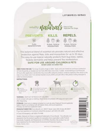 Vetality Naturals Flea & Tick Topicals for Dogs, naturally and effectively, provides 30 days of protection from fleas, ticks & mosquitoes. Powered by a botanical blend of essential oils and natural oils, this easy-to-use topical naturally protects from bug bites, rashes, fleabite dermatitis & helps prevent flea reinfestation. Water resistant. Safe for use around children and pets. For Dogs 12 weeks of age or older.Specifications