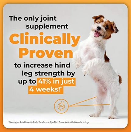 GlycoFlex Plus provides dogs with ultimate strength joint support and is clinically proven to increase hind leg strength by up to 41% in just four 4 weeks. It combines 11 active ingredients, including Perna canaliculus, chondroitin sulfate, glucosamine, MSM and antioxidants to support your dog’s joints and connective tissue. GlycoFlex Plus is recommended by veterinarians for active, competitive and senior dogs suffering from occasional discomfort and mobility issues as a result of joint degradation or inflammation. Dogs love these delicious bite-sized chews available in duck, bacon and peanut butter flavors.Washington State University Study: The effects of GlycoFlex 3 on a stable stifle OA model in dogs.Specifications