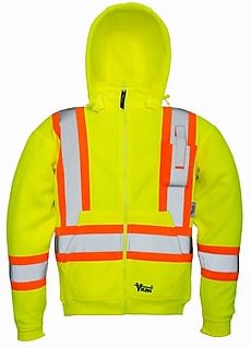2 FRONT STORAGE POCKETS; 2 VI-BRANCE REFLECTIVE MATERIAL IN 4 CONTRASTING TAPE MEETS WCB/WORKSAFE/DOT CONFIGURATION; ANTI-PILL WARM QUICK-DRYING 260 GSM POLYESTER; CELL PHONE POCKET ON LEFT SIDE OF CHEST; COMFORT SNUG ELASTIC WRIST AND WAISTBAND; DUAL REFLECTIVE CHEST STRAPS; FULLY COMPLIANT WITH ANSI/ISEA 107-2015 TYPE R CLASS 3 NOT FR; FULLY COMPLIANT WITH CSA Z96-15 CLASS 2 LEVEL 2 AND BECOMES CSA CLASS 3 IN COMBINATION WITH THE RIGHT MODEL LEG BANDS; IDEAL FOR OUTDOOR JOBS IN COLD TEMPERATURES THAT HAVE LOW VISIBILITY CONSTRUCTION AND TRUCKERS; TAFFETA-LINED SLEEVES; TEAR AWAY DETACHABLE HOOD; UPF ULTRAVIOLET PROTECTION FACTOR RATING OF 50+ BLOCKS 98% OF UV RADIATION FROM PASSING THROUGH THE SHIRT; WARM FULL-SIZE HOOD WITH DRAWSTRING ADJUSTORS