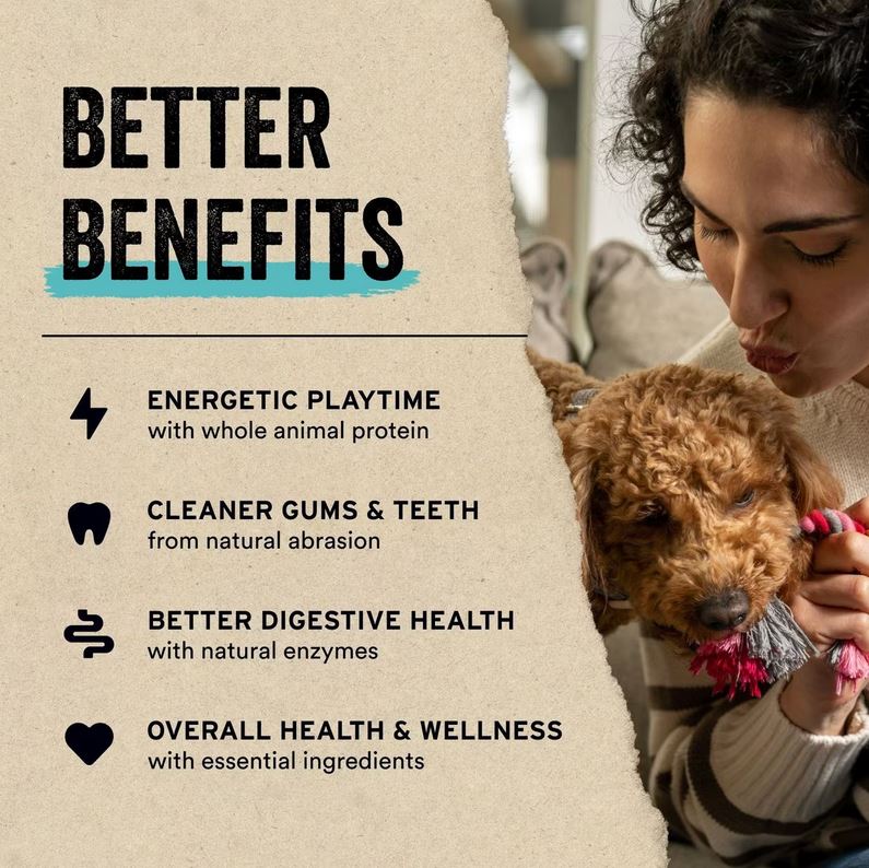 CLEANER TEETH FROM NATURAL ABRASION; IMMUNE & HEART HEALTH WITH ESSENTIAL INGREDIENTS; LEAN, STRONG MUSCLES WITH MUSCLE-BUILDING PROTEIN; MORE ENERGETIC PLAYTIME WITH WHOLE ANIMAL PROTEIN