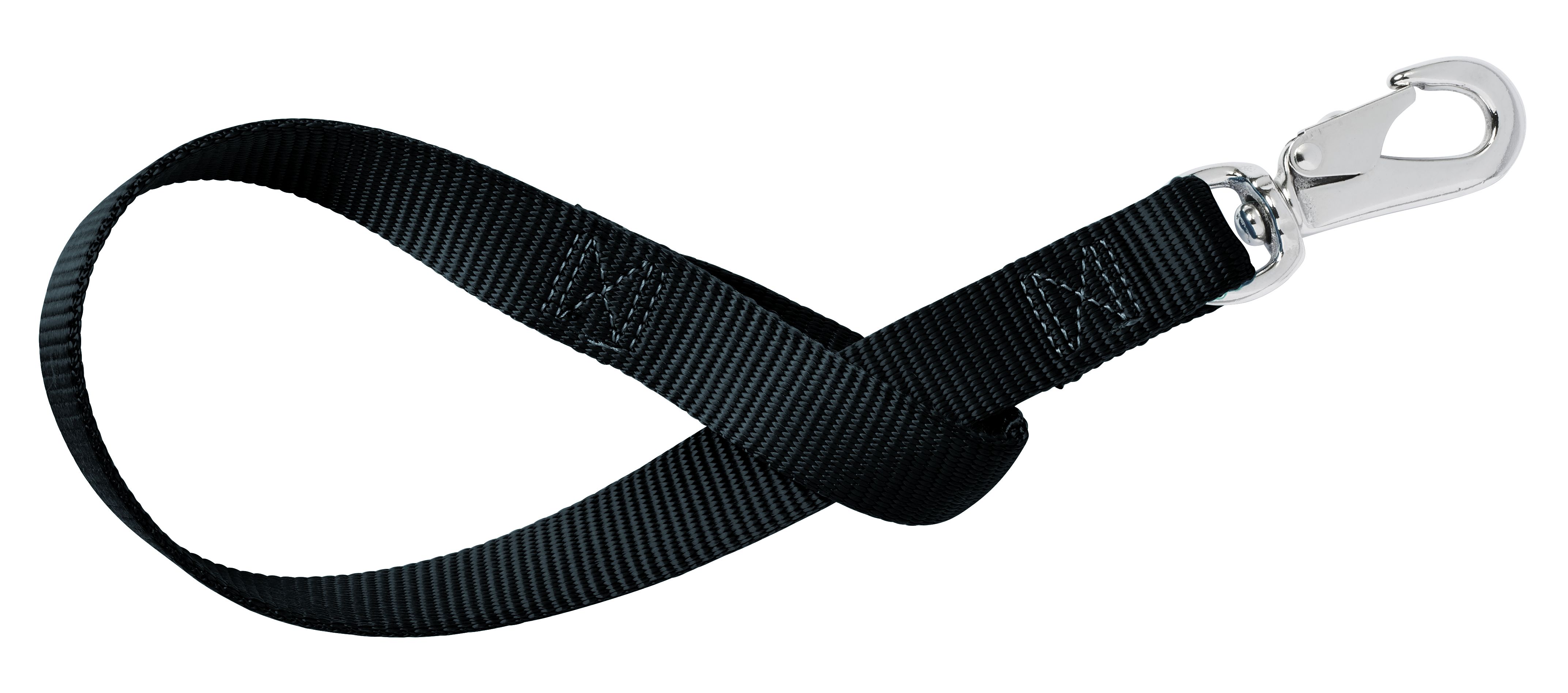 1 INCH BY 22 INCHES; BLACK COLOR; FEATURES A NICKEL PLATED SNAP ON ONE END AND A LOOP ON THE OTHER END WITH A HALF TWIST TO HELP KEEP THE BUCKET HANGING STRAIGHT