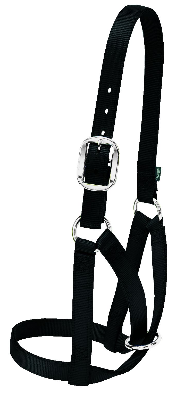 1 INCH NYLON HALTER; BLACK COLOR; DURABLE NICKEL PLATED HARDWARE IS ON-TREND; GREAT FOR TYING IN THE BARN; LARGE SIZE