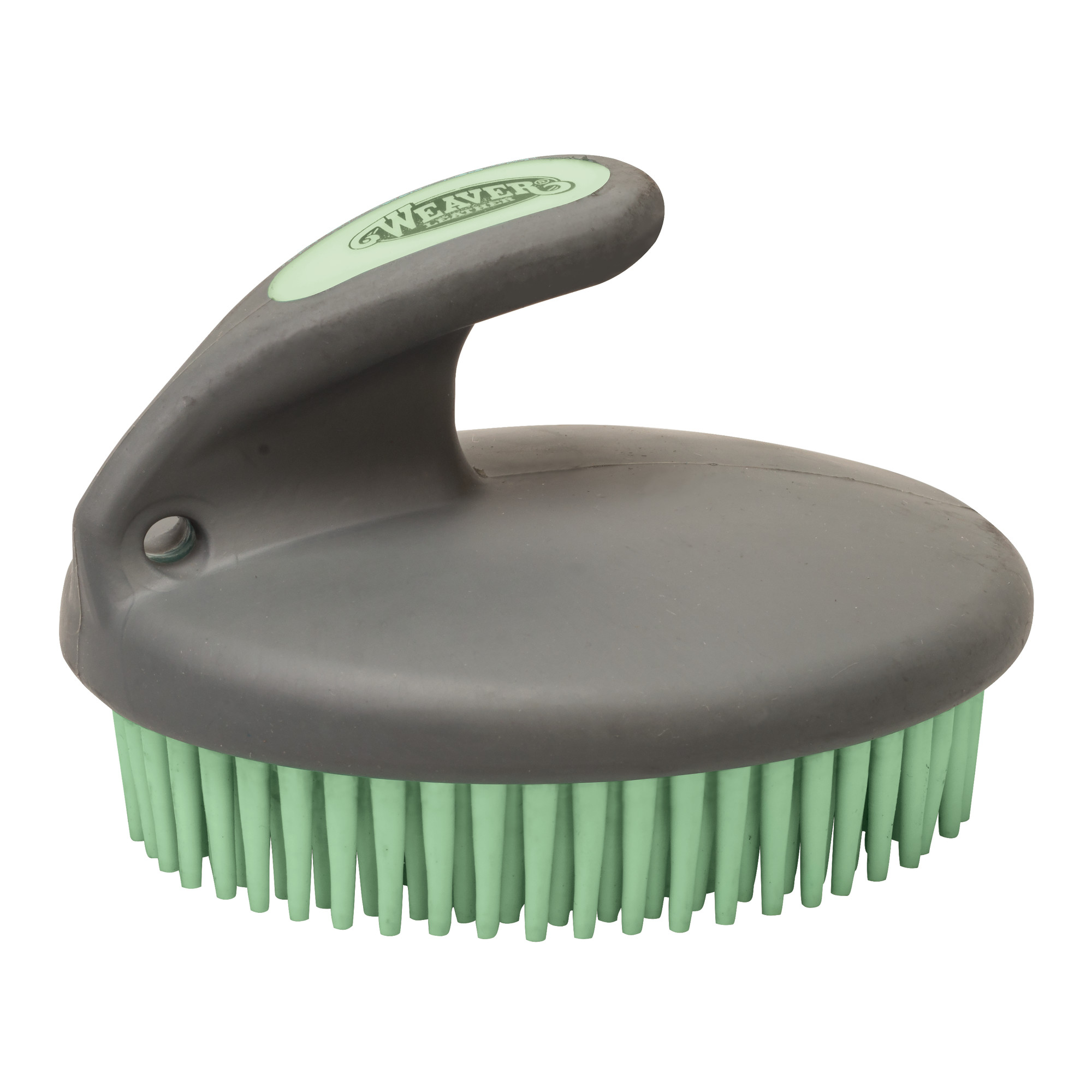 Features small rubber bristles; Handle slides between the index and middle finger for less fatigue; Palm-held design fits snugly in hand