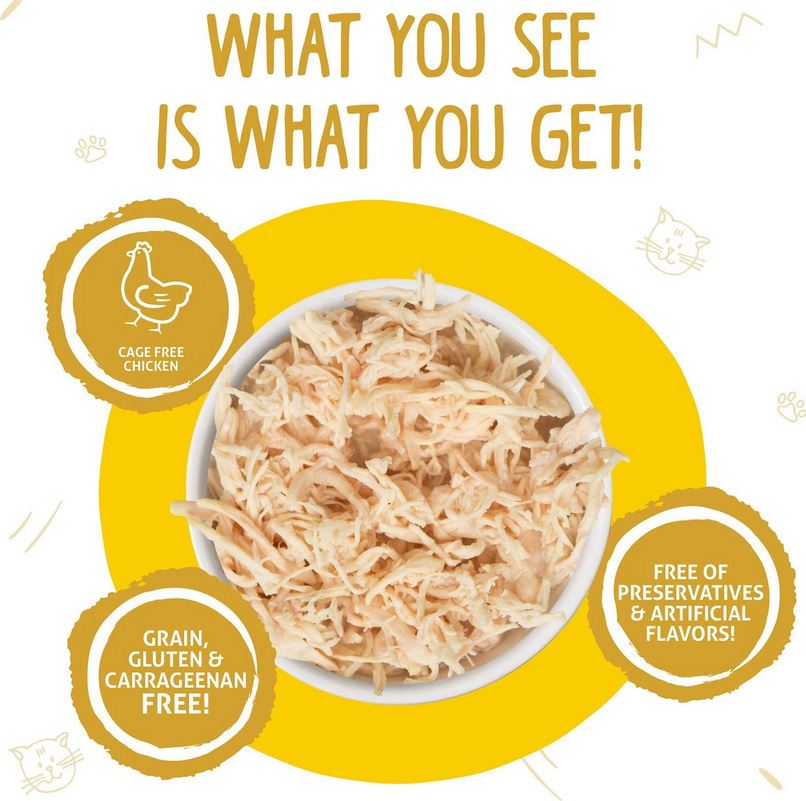 GRAIN, GLUTEN, CARRAGEENAN & MSG FREE; HIGH MOISTURE TO MAINTAIN CATS HYDRATED & HEALTHY; MADE IN A HUMAN FOOD FACILITY; MADE WITH CAGE FREE CHICKEN THAT CONTAIN NO ADDED HORMONES OR ANTIBIOTICS; MADE WITH HAND-FLAKED BONELESS, SKINLESS WHITE CHICKEN BREAST; PRESERVATIVE FREE & MADE WITH NO ARTIFICIAL FLAVORS OR COLORS; SHREDDED RECIPE IN A DELICIOUS GRAVY; WEUVA IS PROUD TO BE A FAMILY OWNED COMPANY