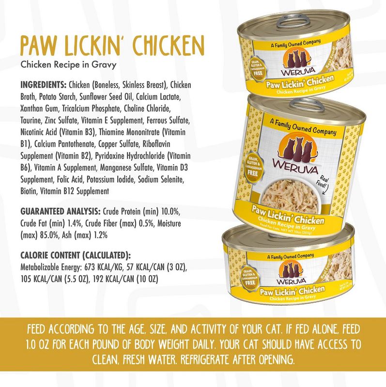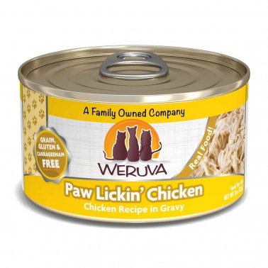 Bring some delicious nutrition to your kitty’s bowl with Weruva Paw Lickin' Chicken in Gravy Grain-Free Canned Cat Food. Made with shredded chicken as the first ingredient, every bite is loaded with the meat your little carnivore craves, and all the protein he needs for healthy muscles. Since it’s formulated with a perfectly-balanced blend of vitamins, minerals and heart-healthy taurine, every easy-open can is actually a complete mealon its own or as a tasty kibble topper. It’s no wonder that for cats everywhere, Weruva is also known as the best cat food under the sun!Specifications