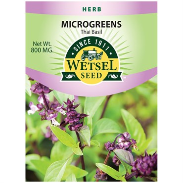 These microgreens taste like basil, however they have hint of licorice and pepper in their flavor. Thai basil is high in antioxidants and can be used as a colorful garnish on any dish, but it is commonly used in curries, stir fries and soups. When and where to plant: Broadcast sow in shallow containers year round in an indoor location with bright light. Supplemental bottom heat may aid germination. Care: Keep evenly moist by watering from the bottom and rotate the container for even light coverage if needed. Harvesting: Harvest as soon as the second set of leaves form by making a dean cut through the base of stems with sharp scissors. Storage: Store seed in cool, dry place. Heat and moisture can severely reduce germination.Specifications