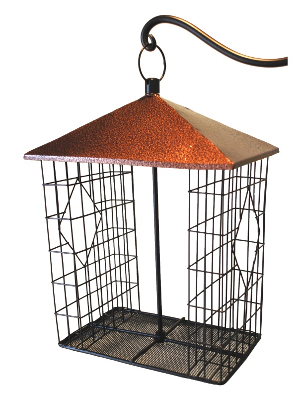Built-in chain and hook hanger; Durable and attractive design with an antiqued cooper roof; Easy to clean and simple to use; Holds up to 4 suet cakes; Mesh bottom for drainage; Weather resistant