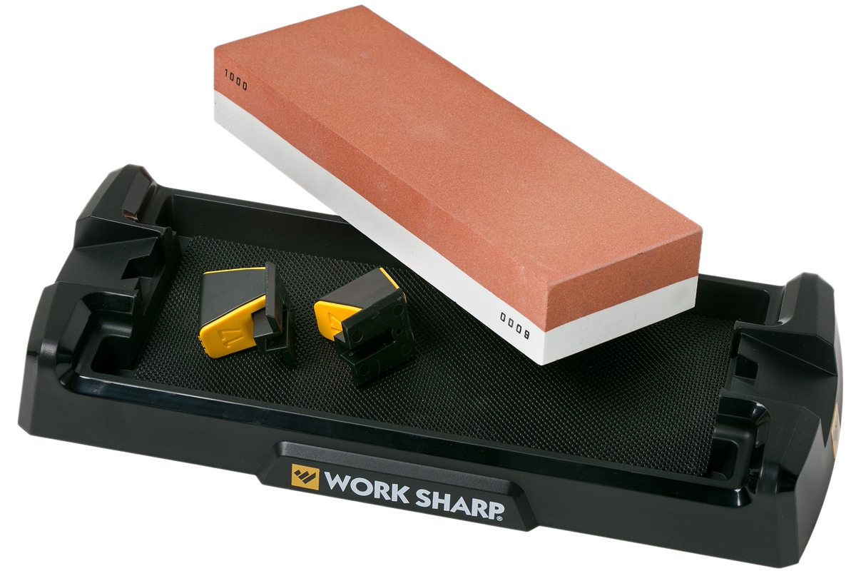 The Work Sharp Benchtop Whetstone is an Angle Guided, Dual-Grit sharpening water stone for knives and fine edge tools. Premium 1000 grit and 6000 grit aluminum oxide sharpening stone creates incredibly keen edges. Use 1000 grit to sharpen and restore an edge, then 6000 to create a highly refined edge and surface finish. Water stone is fast cutting, long lasting and creates a slurry when sharpening. Sharpening base provides a stable platform and increased water control for less mess and faster clean up. Anti-skid feet ensure a safe and stable process. Angle Guides create precision and consistency to maintain an edge making sharpening faster and easier. Sharpening Guides are interchangeable from 15° or 17° and optional to use, additional 20° and 25° Sharpening Guides Sold Separately. Sharpens kitchen knives of all types and can also be used on pocket and outdoor knives. Professional level whetstone knife sharpening made easy. Angle Guides and Water Control Base provide precision, consistency and a cleaner, superior sharpening experience than other water based sharpening systems.Specifications